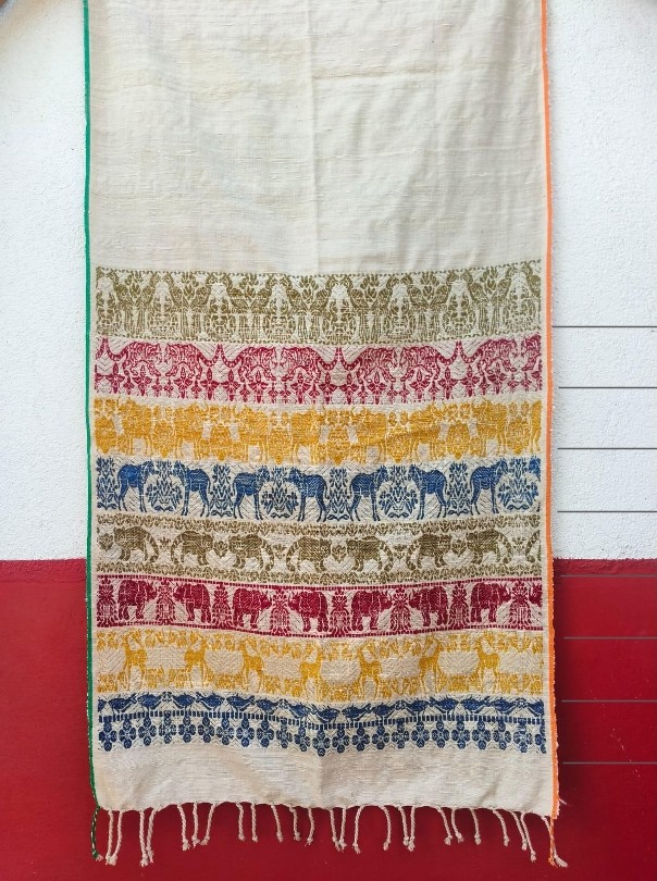 नागालैंड की खियामनियुंगन नागा जनजाति द्वारा पहने जाने वाले इस वस्त्र के पीछे धीरे-धीरे विलुप्त होती परंपराओं के पुनर्निर्माण की एक गहरी कहानी है। स्थानीय महिलाएं ऑरेंज वाइल्ड रिया पौधे और बिच्छू घास (जिसे वहाँ 'एहलोन निउ' कहा जाता है) के तनों से प्राप्त रेशों से यह दुर्लभ वस्त्र बनाती हैं। रेशों को जंगलों से इकट्ठा किया जाता है, हाथ से बारीक धागों में अलग किया जाता है, सूत में काता जाता है और हाथ से बुना जाता है। चुनौतियों के बीच जन्मी यह कला, अब परंपराओं और गौरव का प्रतीक बन गई है। स्क्रॉल पर प्रदर्शित नमूना जॉब्स टीयर्स (गवेधुका या एडले मिलेट) पौधे के दानों से सजाया गया है, जिनका उपयोग इस क्षेत्र में आभूषण बनाने के लिए किया जाता है।